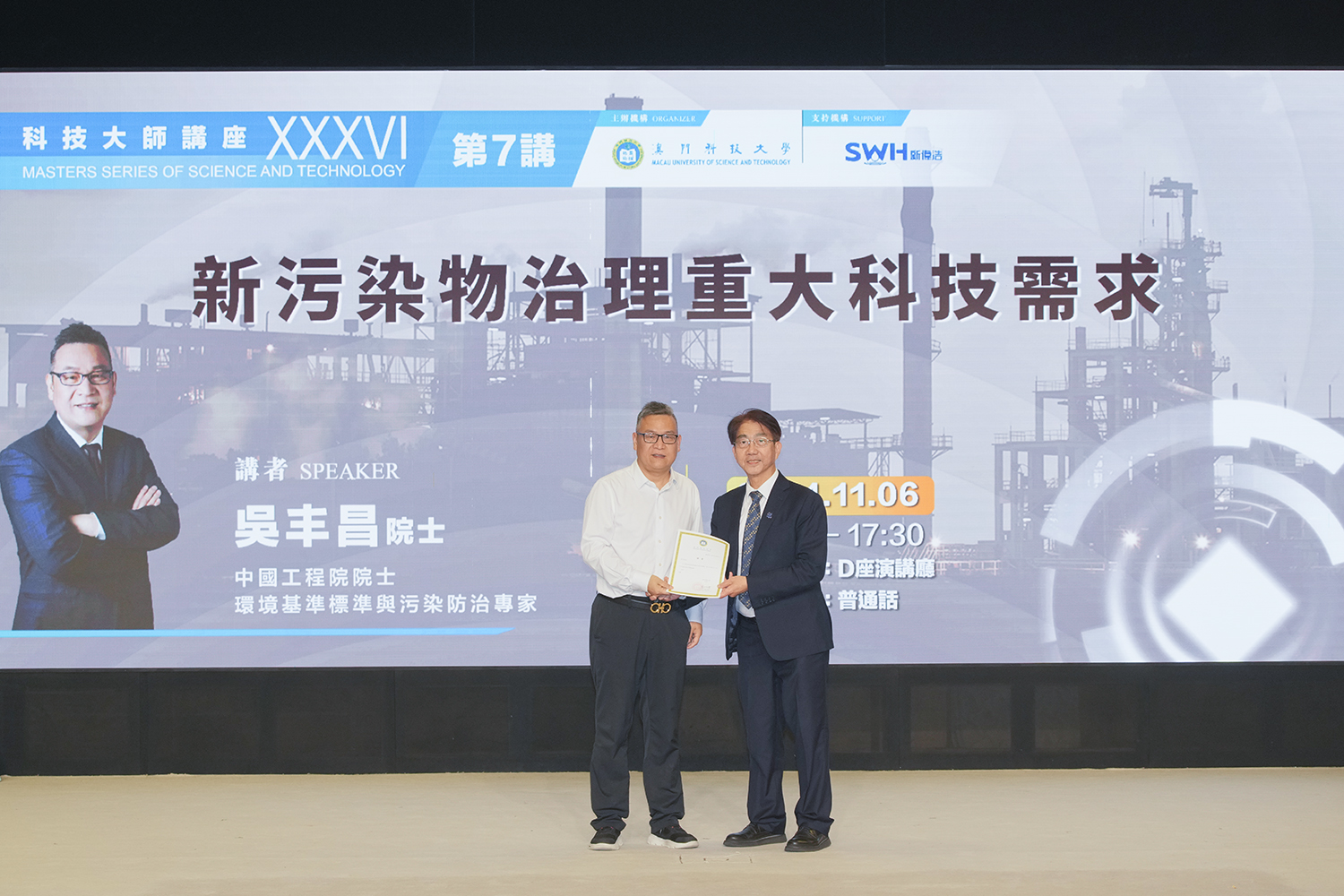 由澳門科技大學主辦,新偉浩進出口貿易有限公司支持的科技大師講座「新污染物治理重大科技需求」於2024年11月6日下午在大學D座演講廳成功舉辦。講座邀請到中國工程院院士、環境基準標準與污染防治專家吳丰昌...