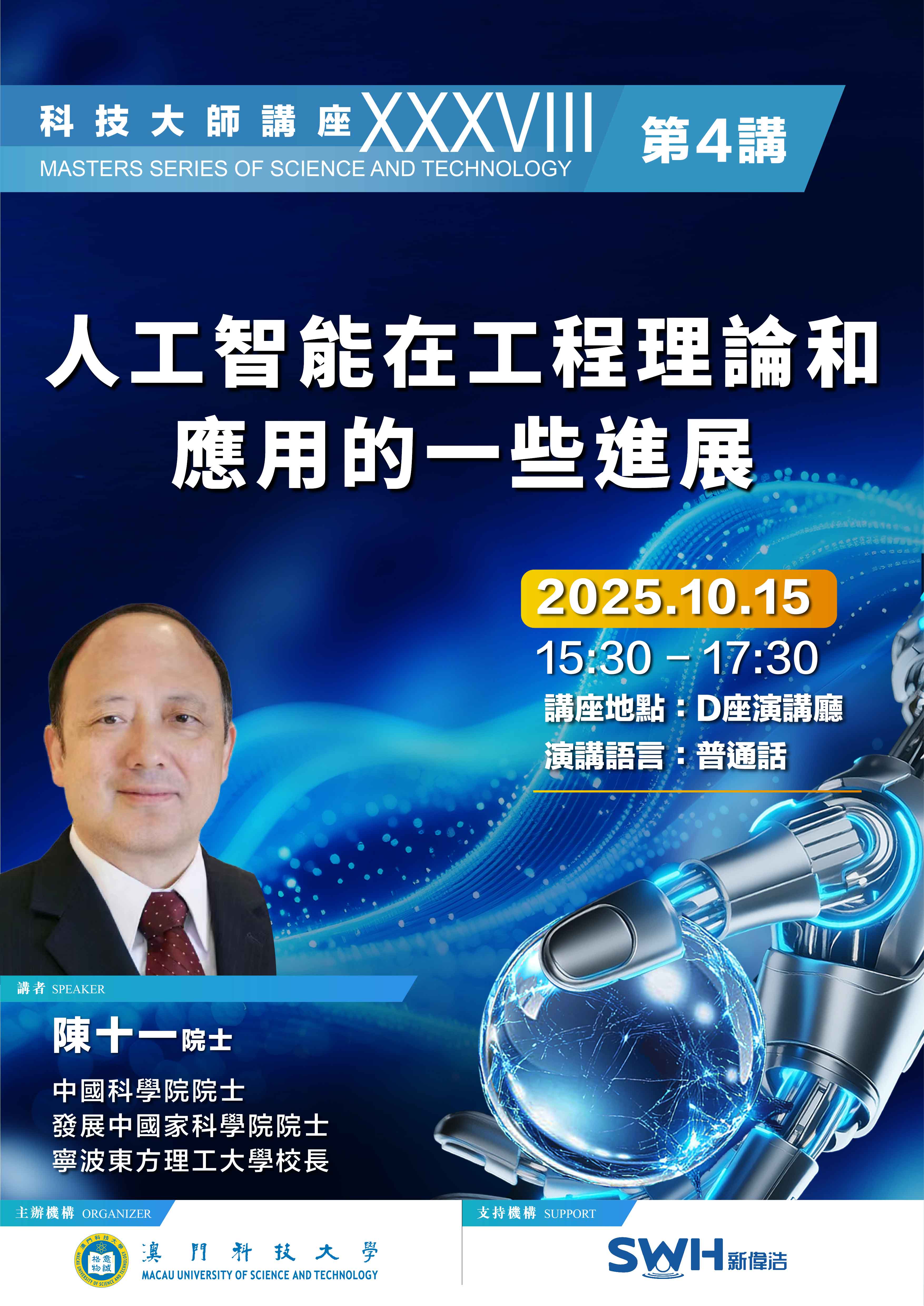 【活動預告】《科技大師講座XXXVIII》第四場-中國科學院院士、發展中國家科學院院士、寧波東方理工大學校長陳十一院士於澳科大談「人工智能在工程理論和應用的一些進展」
