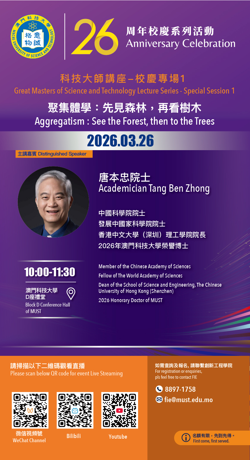 日期:2026年3月26日(星期四)時間:10:00-11:30地點:澳門科技大學D座禮堂主題:「聚集體學:先見森林,再看樹木」嘉賓: 唐本忠院士 (中國科學院院士、發展中國家科學院院士,香港中文大學...