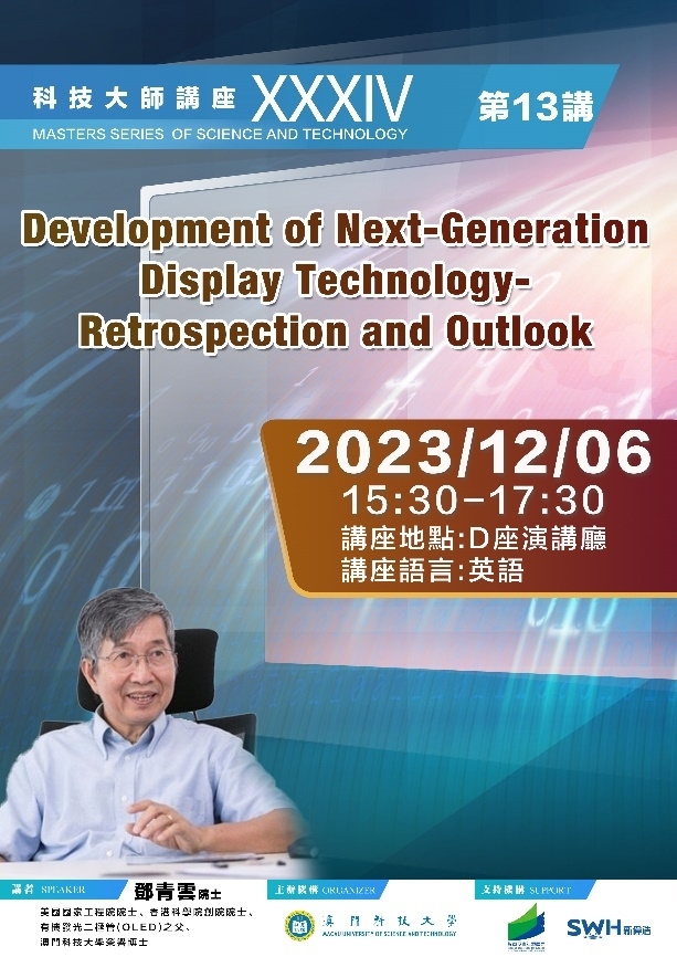 【活动预告】《科技大师讲座XXXIV》第十三场 - Development of Next-Generation Display Technology – Retrospection and Outlook