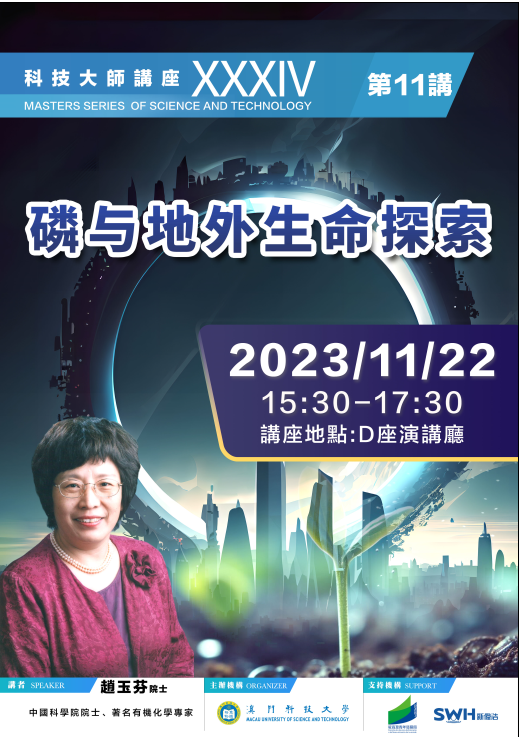 【活动预告】《科技大师讲座XXXIV》第十一场 - 磷与地外生命探索日期:2023年11月22日(周三)时间:下午3:30-5:30地点:澳科大D座演讲厅主题:磷与地外生命探索嘉宾:赵玉芬院士——中国...