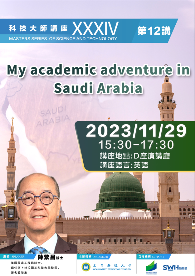 【活动预告】《科技大师讲座XXXIV》第十二场 - My academic adventure in Saudi Arabia日期:2023年11月29日(周三)时间:下午3:30-5:30地点:澳科...