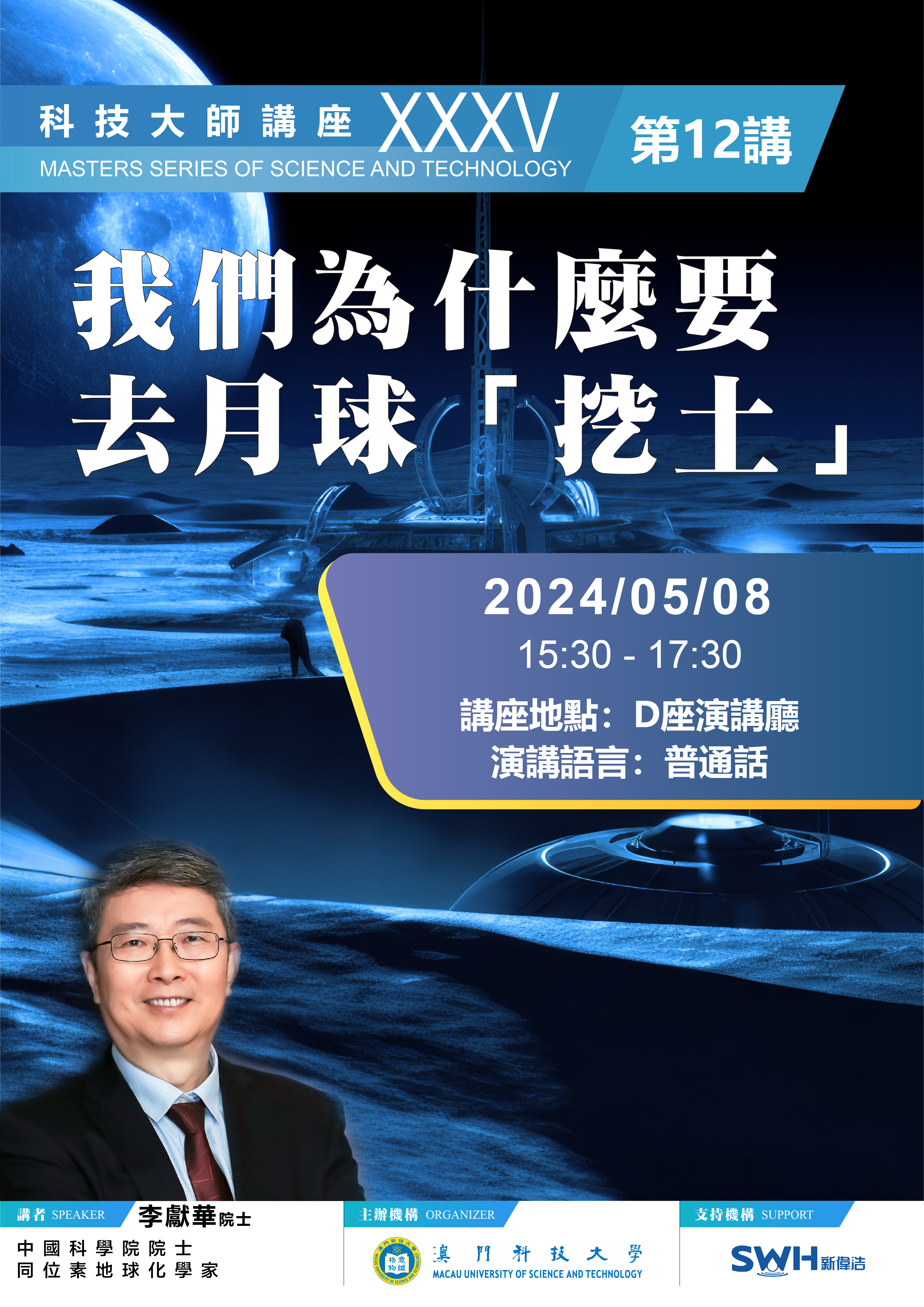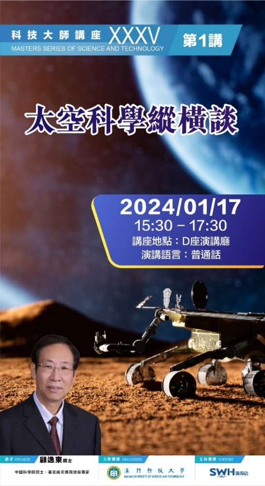 【活动预告】《科技大师讲座XXXV》第一场 - 太空科学纵横谈日期:2024年1月17日(周三)时间:下午3:30-5:30地点:澳科大D座演讲厅主题:太空科学纵横谈演讲语言 : 普通话嘉宾:顾逸东院...
