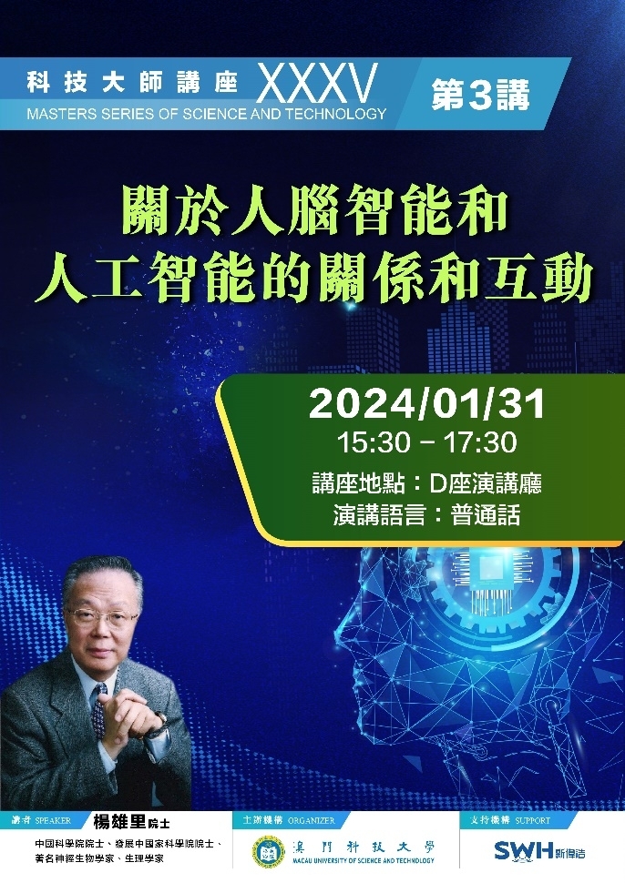 【活动预告】《科技大师讲座XXXV》第三场 - 关于人脑智能和人工智能的关系和互动日期:2024年1月31日(周三)时间:下午3:30-5:30地点:澳科大D座演讲厅主题:关于人脑智能和人工智能的关系...