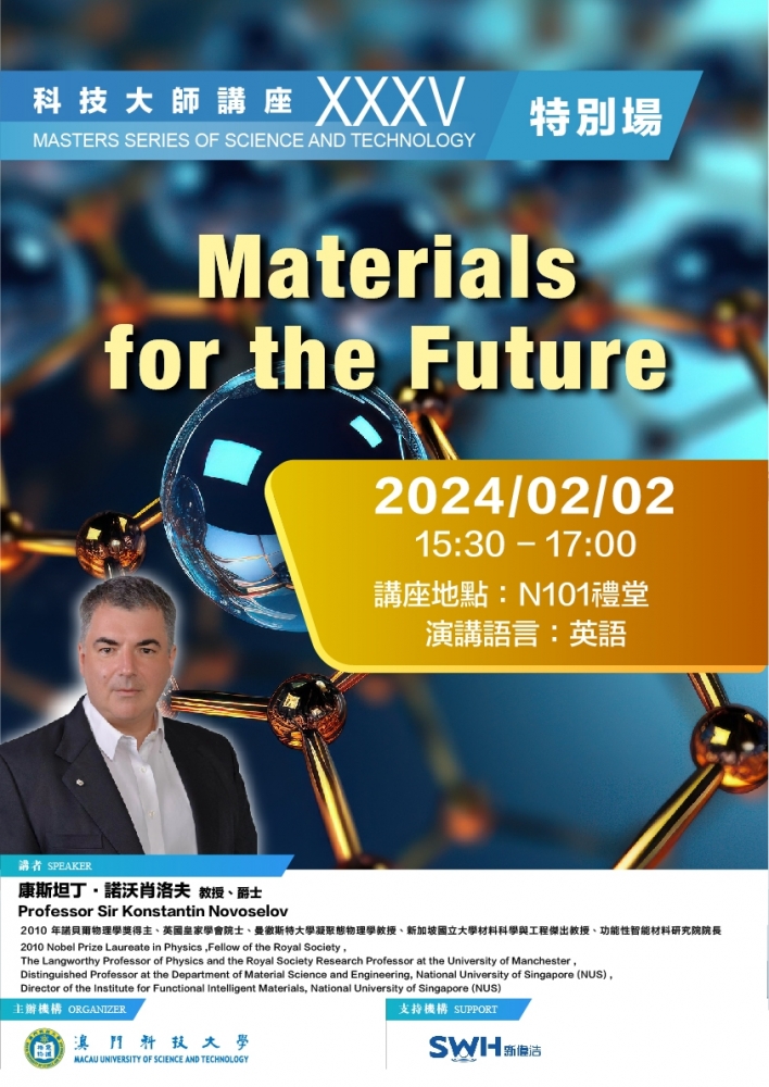 【活动预告】:《科技大师讲座XXXV》特别场 - “Materials for the Future”日期:2024年2月2日(周五)时间:下午3:30-5:00地点:澳科大N座 N101礼堂主题:M...