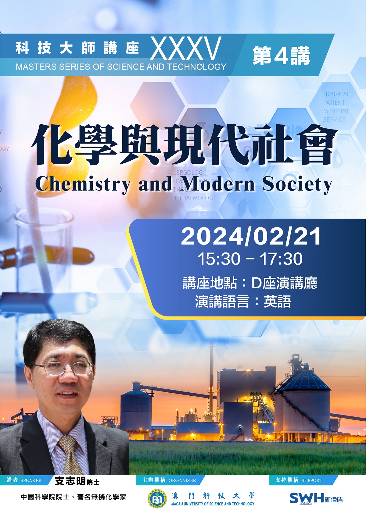 【活动预告】《科技大师讲座XXXV》第四场 - 化学与现代社会日期:2024年2月21日(周三)时间:下午3:30-5:30地点:澳科大D座演讲厅主题:化学与现代社会 "Chemistry ...