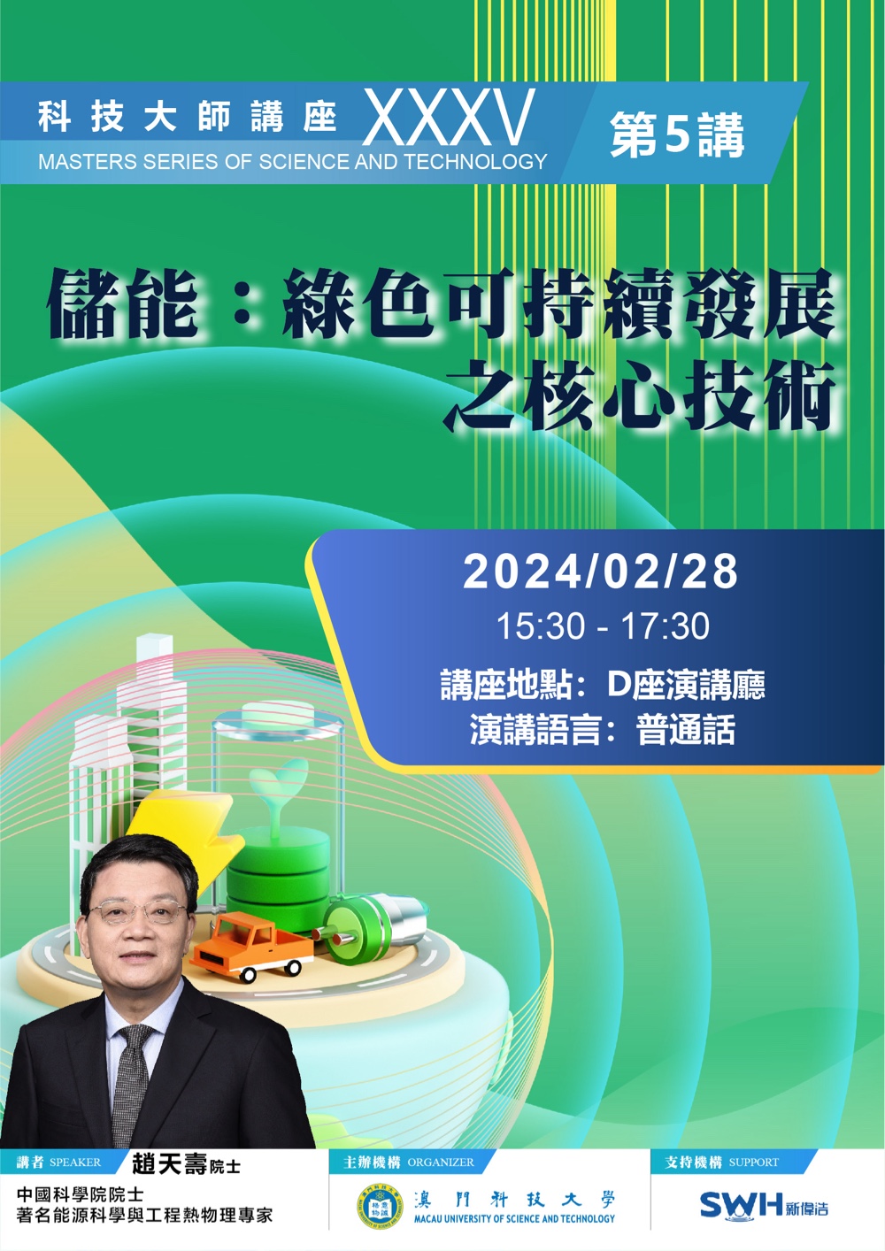活动预告:中国科学院院士、著名能源科学与工程热物理专家赵天寿谈“储能:绿色可持续发展之核心技术”由澳门科技大学主办,新伟浩进出口贸易有限公司支持的本学期第五场科技大师讲座将于2月28日(周三)下午3:...