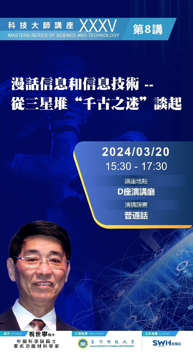 日期:2024年3月20日(周三)时间:下午3:30-5:30地点:澳科大D座演讲厅主题:漫话信息和信息技术 -- 从三星堆“千古之迷”谈起嘉宾:祝世宁院士——中国科学院院士、著名功能材料学专家由澳门...