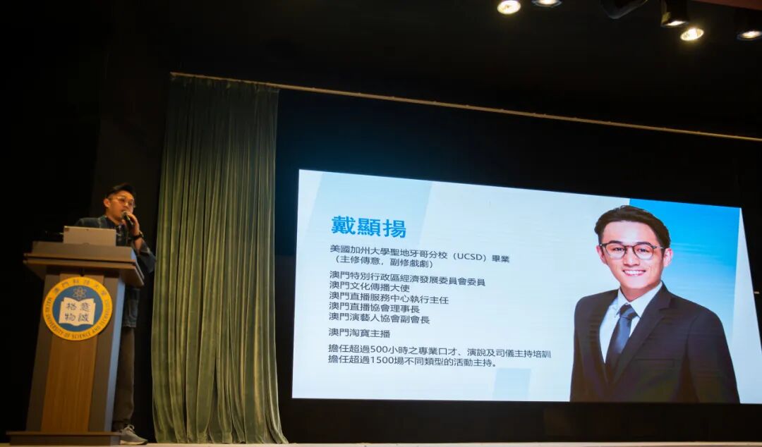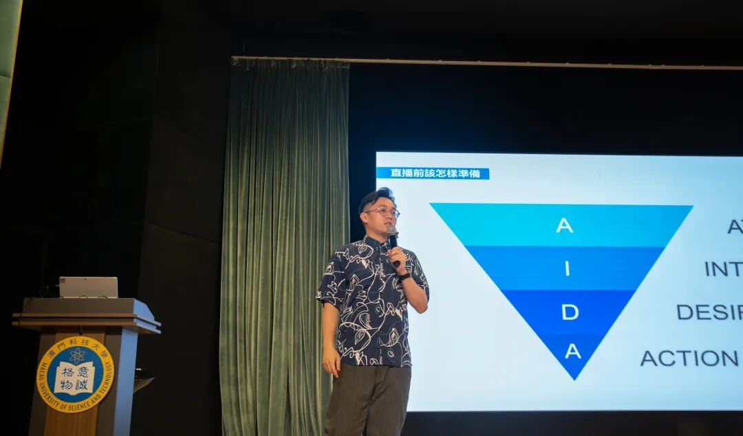 講座伊始,戴顯揚先生和現場及線上的觀眾們進行了一系列互動,讓大家了解到一些直播術語。隨著大屏幕上的圖片展示,戴先生向大家介紹了直播常見媒體並展示了直播行業在澳門的發展。隨後,他又向大家詳細講解了直播前的準備,將最經典的「 AIDA 」直播產出方法聲情並茂地介紹給了大家,使同學們掌握了直播的流量密碼。