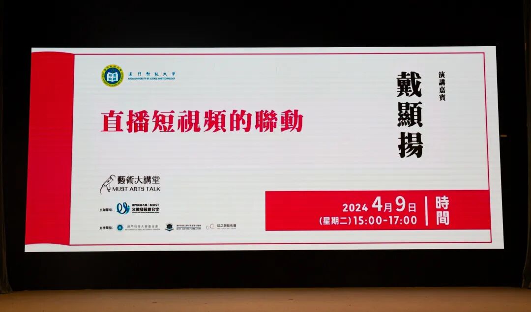 由澳門科技大學文體發展辦公室主辦的「藝術大講堂」系列講座之「直播短視頻的聯動」於2024年4月9日下午於澳門科技大學 D 座大禮堂成功舉辦。本場講座邀請到了澳門特別行政區政府經濟發展委員會委員、澳門直播協會理事長、澳門直播服務中心執行主任戴顯揚主講。
