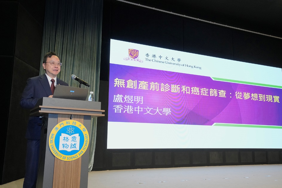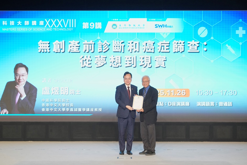 由澳門科技大學主辦的「科技大師講座」系列講座之「無創產前診斷和癌症篩查:從夢想到現實」於2025年11月26日(星期三)下午在澳科大D座禮堂成功舉辦,本講座邀請到中國科學院院士、香港中文大學校長、香港中文大學李嘉誠醫學講座教授盧煜明院士主講。澳科大副校監、校長李行偉線上致辭並歡迎盧煜明院士為澳科大師生作專題演講,副校長譚廣亨向盧煜明院士頒發榮譽聘書並致送紀念品。