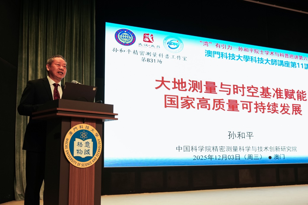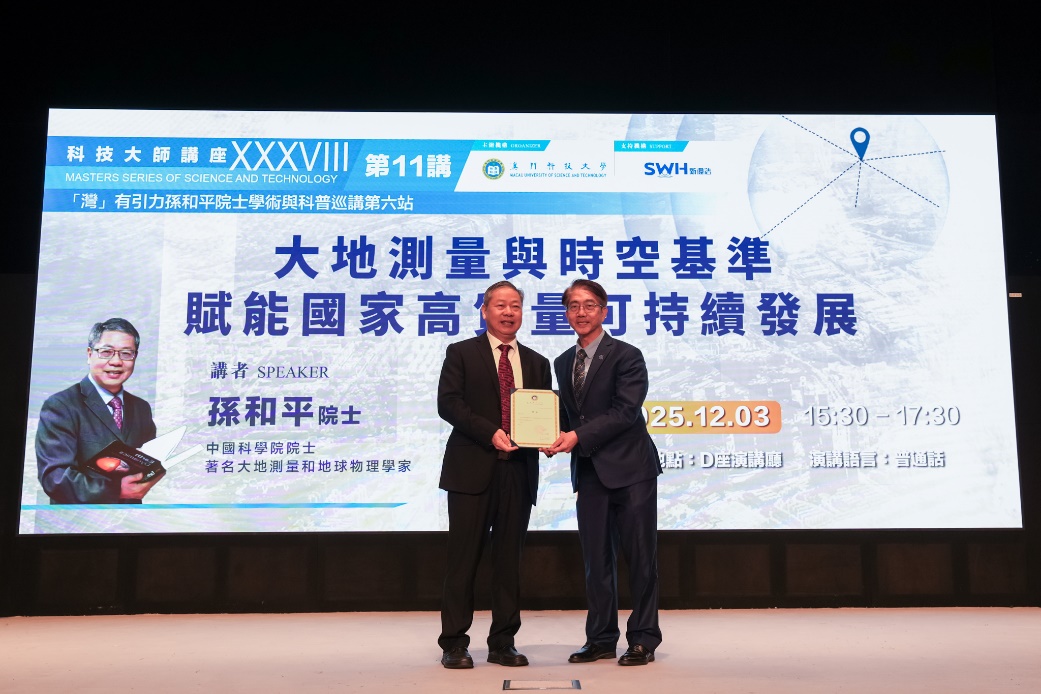 由澳門科技大學主辦的科技大師講座「大地測量與時空基準賦能國家高質量可持續發展」,於 2025年12月3日(星期三)D座演講龐成功舉辦。本講座邀請到中國科學院院士、著名大地測量和地球物理學家孫和平院士主講。澳門科技大學副校監、校長李行偉講座教授為本次講座致辭,並向孫院士頒發聘書及致送紀念品。