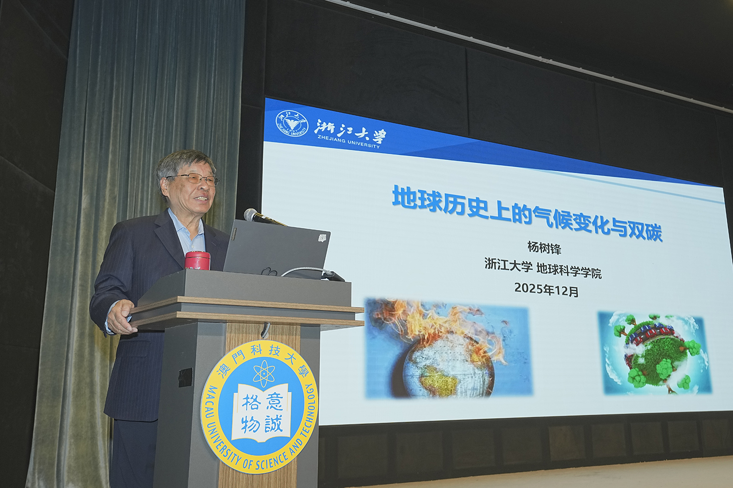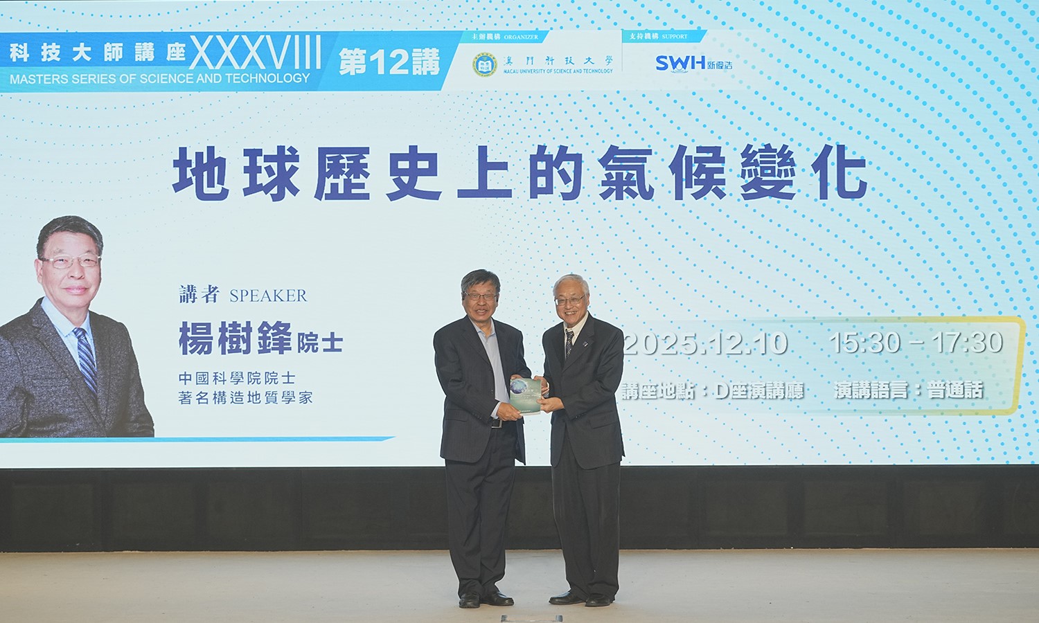 由澳門科技大學主辦的科技大師講座「地球歷史上的氣候變化與雙碳」於 2025 年 12 月 10 日(星期三)下午在 D座演講廳成功舉辦。本講座邀請到中國科學院院士、著名構造地質學家楊樹鋒院士主講。澳門科技大學校副校監、校長李行偉講座教授線上致辭,譚廣亨副校長向楊院士致送紀念品。