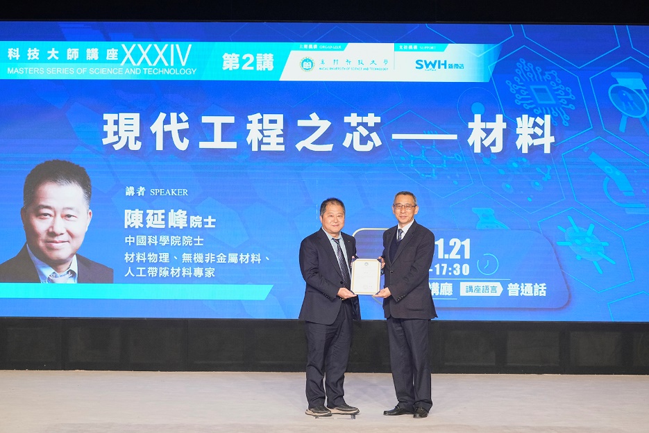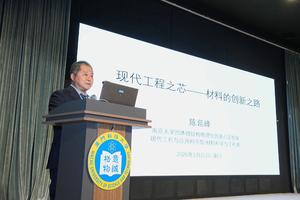 由澳門科技大學主辦的科技大師講座「現代工程之芯 ── 材料」,於 2026 年 1 月 21 日(星期三)下午在澳科大D座禮堂成功舉辦。本講座邀請到中國科學院院士,材料物理、無機非金屬材料、人工帶隙材料專家陳延峰院士主講。澳科大副校長姜志宏講座教授為本次講座致辭,並向陳院士頒發榮譽聘書及致送紀念品。