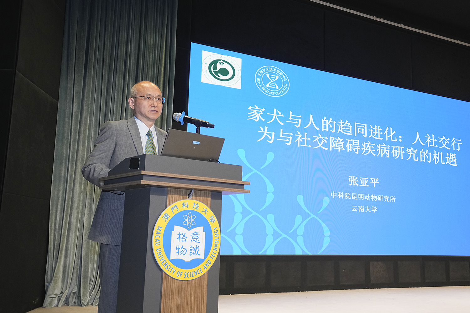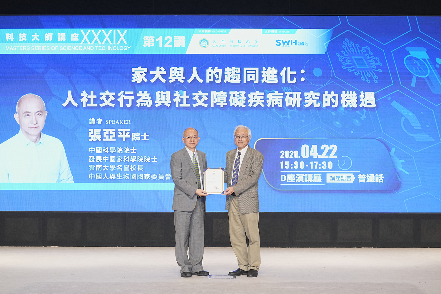 由澳门科技大学主办的科技大师讲座「家犬与人的趋同进化:人社交行为与社交障碍疾病研究的机遇」于2026年4月22日下午在大学D座演讲厅成功举办。本场讲座邀请到中国科学院院士,发展中国家科学院院士,云南大学名誉校长,中国人与生物圈国家委员会主席张亚平院士主讲。谭广亨副校长致辞并向张院士颁发荣誉聘书及致送纪念品,欢迎并感谢张亚平院士为澳科大师生作专题演讲。朱依谆副校长、许敖敖荣休校长亦出席现场聆听讲座。