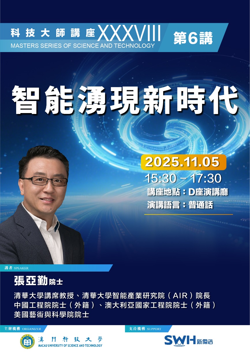 由澳門科技大學主辦,新偉浩進出口貿易有限公司支持的本學期第六場科技大師講座2025年11月5日下午3:30於大學D座演講廳舉行,清華大學講席教授、清華大學智能產業研究院(AIR)院長、中國工程院院士(外籍)、澳大利亞國家工程院院士(外籍)、美國藝術與科學院院士,張亞勤院士主講「智能湧現新時代」。