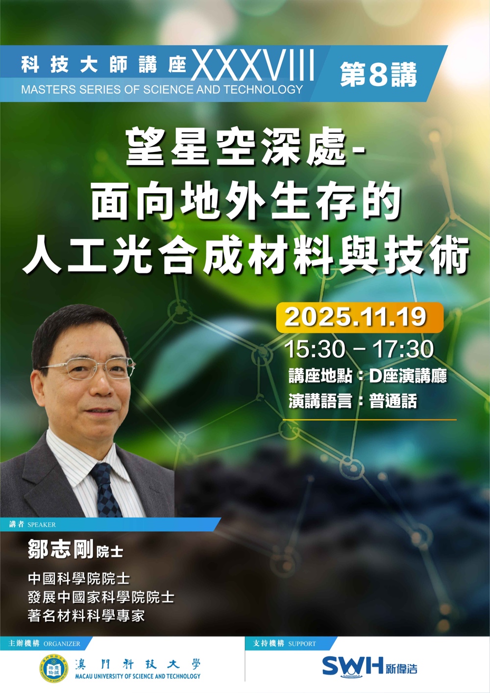 由澳門科技大學主辦,新偉浩進出口貿易有限公司支持的本學期第八場科技大師講座將於11月19日(週三)下午15:30在大學D座演講廳舉行。屆時邀請到中國科學院院士、發展中國家科學院院士、著名材料科學專家鄒志剛院士主講。