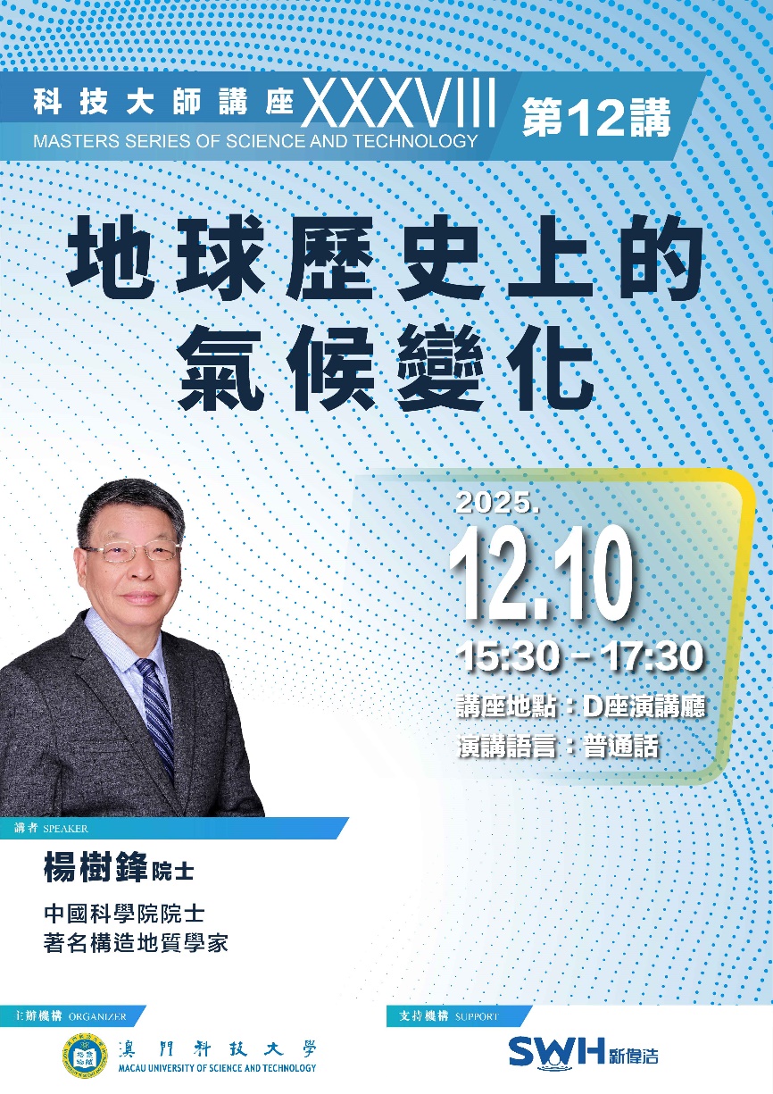 由澳門科技大學主辦,新偉浩進出口貿易有限公司支持的本學期第十二場科技大師講座將於12月10日(週三)下午15:30在大學D座演講廳舉行,中國科學院院士、著名構造地質學家楊樹鋒院士主講。