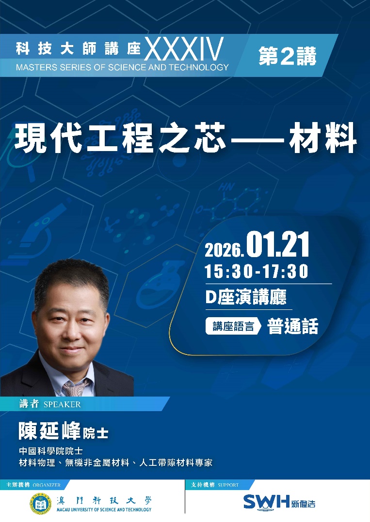 由澳門科技大學主辦,新偉浩進出口貿易有限公司支持的本學期第二場科技大師講座於2026年1月21日下午15:30在大學D座演講廳舉行,中國科學院院士,材料物理、無機非金屬材料、人工帶隙材料專家陳延峰院士主講「現代工程之芯 —— 材料」。