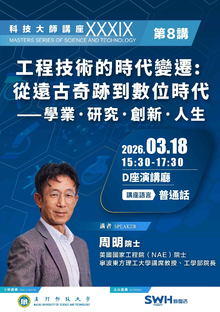 由澳门科技大学主办,新伟浩进出口贸易有限公司支持的本学期第八场科技大师讲座于2026年3月18日下午15:30在大学D座演讲厅举行,美国国家工程院(NAE)院士,宁波东方理工大学讲席教授、工学部院长周明院士主讲「工程技术的时代变迁: 从远古奇迹到数位时代——学业·研究·创新·人生」。