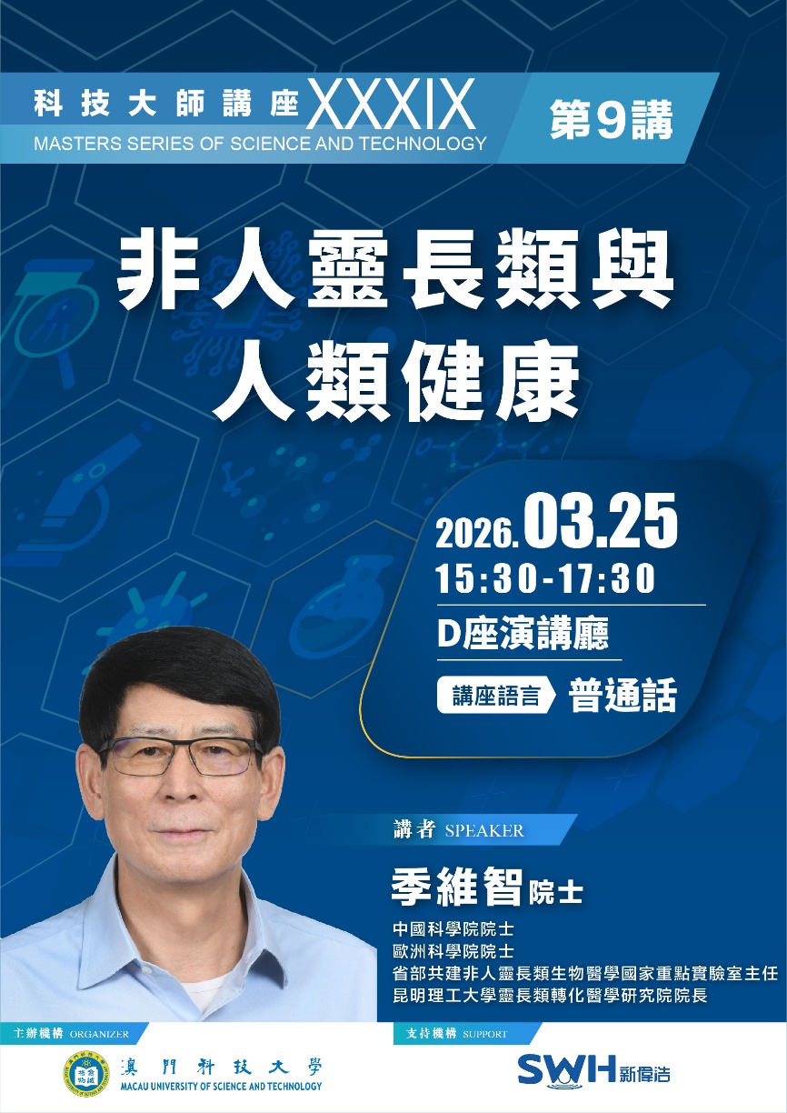 由澳门科技大学主办,新伟浩进出口贸易有限公司支持的本学期第九场科技大师讲座于2026年3月25日下午15:30在大学D座演讲厅举行,中国科学院院士、欧洲科学院院士、省部共建非人灵长类生物医学国家重点实验室主任、昆明理工大学灵长类转化医学研究院院长季维智院士主讲「非人灵长类与人类健康」。