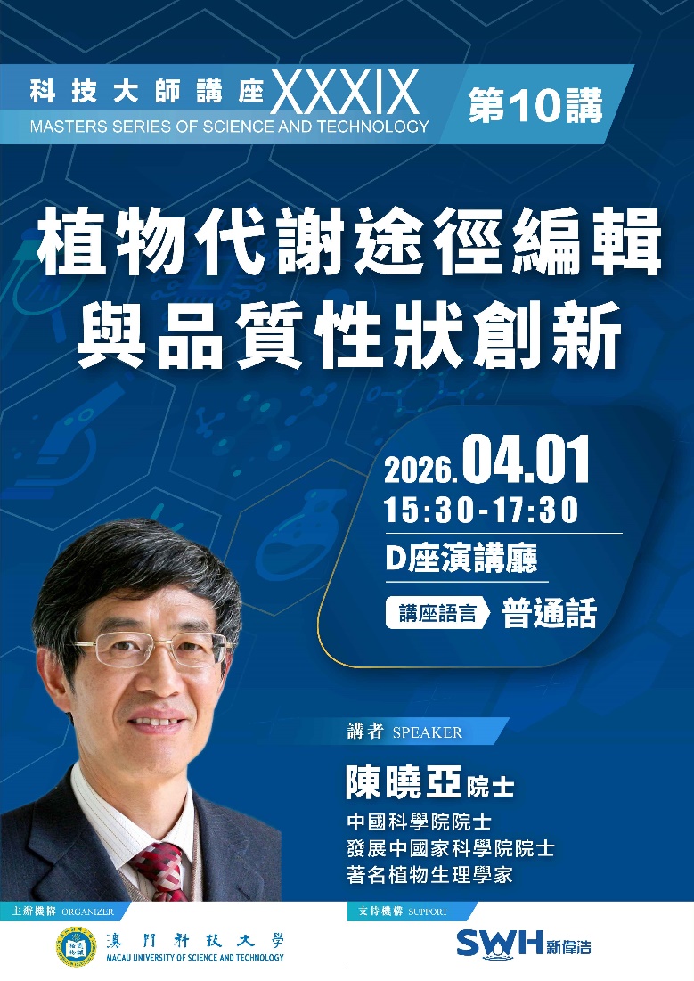 由澳門科技大學主辦,新偉浩進出口貿易有限公司支持的本學期第十場科技大師講座將於4月1日(週三)下午15:30在大學D座演講廳舉行,中國科學院院士、發展中國家科學院院士、著名植物生理學家陳曉亞院士主講。